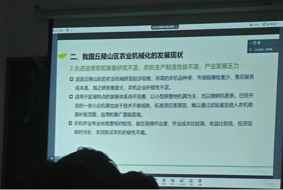 陈学庚院士围绕我国发展丘陵山区农业机械化的战略意义、我国丘陵山区农业机械化的发展现状、日韩及中国台湾经验和我国丘陵山区农业机械化的发展目标四个主题进行系统讲述,并对四川发展丘陵山地农业机械化提出了土地宜机化改造、走小而精的农机化发展模式、注重结合自身发展大力发展数字化技术等发展思路让与会师生对我国丘陵山区农业机械化的发展方向措施有了更加深刻理解,也为广大师生的科研选题提供了更多的选项和思路。