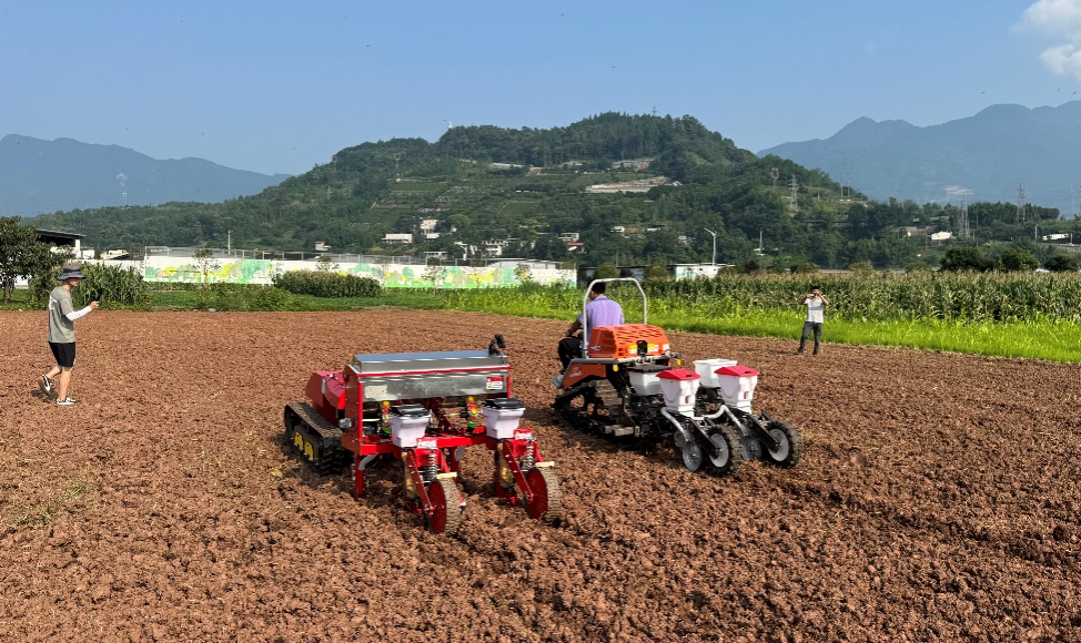 本次示范会展示了项目团队自主研发的电驱履带式玉米精量播种机以及油驱履带式玉米精量播种机的田间作业全过程。这两款装备基于丘陵地形与小规模种植模式的实际需求进行研发,采用履带式自走底盘,具备良好的地形适应性和通过性。同时整机结构紧凑,集播种、施肥、覆土于一体,具备操作简便、作业效率高、播深一致性好等优点。