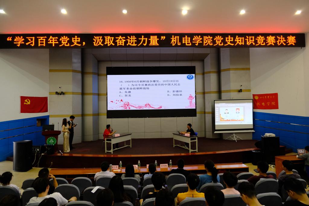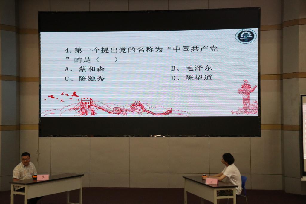 百名师生选手通过现场竞答庆祝建党百年。决赛分为在线答题100进10、1V1抢答10进5、复活赛95进2、冠军争夺赛7进5、现场互动问答几个环节。100进10环节将百名选手分成五组,依次带至场外进行答题,场内进行党史视频学习有奖竞答互动,通过观看《觉醒年代》、《百年党史100秒》等视频,现场两百余名中共党员和入党积极分子争相回答“五四运动的时间?”“中共一大在哪召开?”“《中国共产党章程》在党的第几次代表大会通过?”现场气氛热烈。