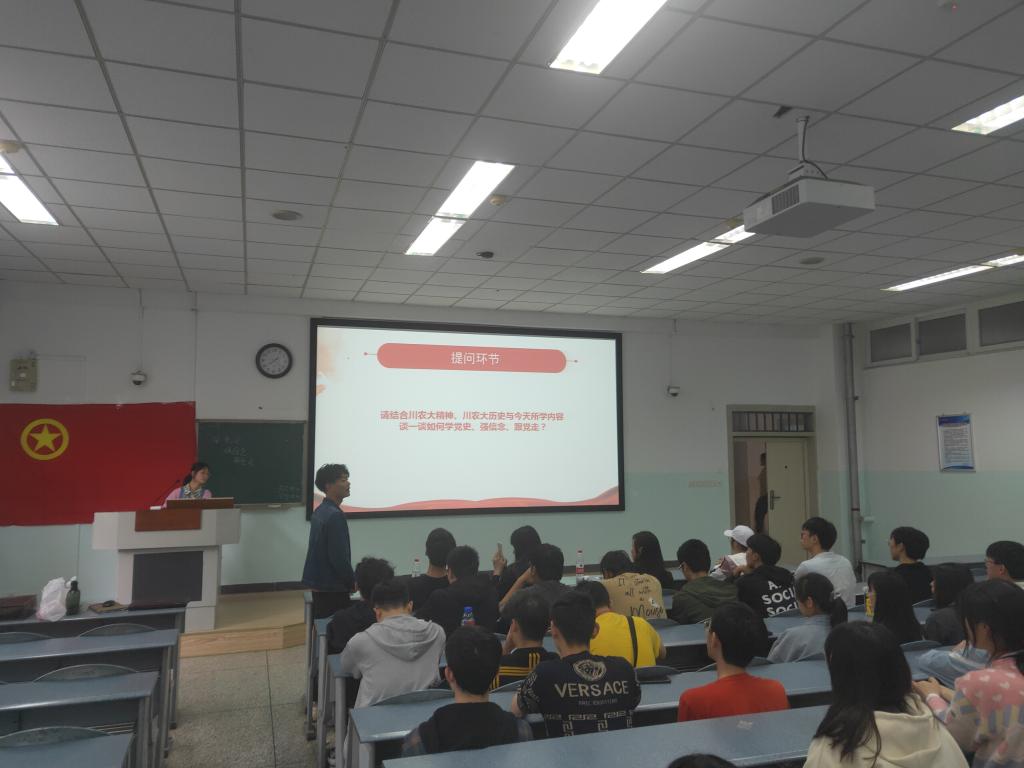 充分活跃现场之后,主持人严肃地向全体团员进行提问,“结合川农大精神、川农大历史以及团日活动的内容谈一谈作为当代川农员工,我们应该如何进一步学党史,强信念,跟党走?”。来自xc体育的邹梓浩感悟深刻,“我们的川农大精神包括:爱国敬业,艰苦奋斗,团结拼搏,求实创新四个层次,我认为这四个层次,不仅是川农大的精神所在,也是我们党,我们国家的精神所在。正是因为有一群爱国之士的存在,一百年前,一群满腔热血的爱国青年,冒着生命危险,创立了中国共产党,也正是有无数的爱国之士的存在,中国人民才能在艰难困苦中战胜帝国主义,战胜封建主义,成立新中国;艰苦奋斗,团结拼搏,是中华民族从来不或缺的精神,我们的祖辈,父辈,用他们的热血与汗水,完成了三大改造,完成了一五计划,实现了改革开放,中华儿女心往一处想,劲往一处使,完成了航天梦,完成了跨月梦,完成了从站起来,到富起来再到强起来的历史飞跃;求实创新,是川农大精神的要求,也更是党和国家对我们的期待,一代人有一代人的责任,我们恰能生逢其时,我们不用像先烈们去抛头颅洒热血,我们也不会像祖辈,父辈们忍饥挨饿,时代赋予我们的则是特殊的任务,需要我努力学习知识,战斗在没有硝烟的战场,不断去探索科学的前端,努力为祖国的发展建设献出我们的绵薄之力。”