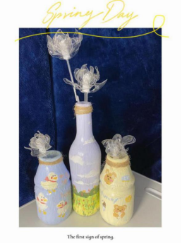 活动中期精彩纷呈、创意满分。活动参与人数远远超过预期,虽然是线上评选,同学们仍以各种方式在作品中阐述了“变废为宝”的环保理念,天马行空的创意、精美绝伦的外观让人叹为观止。一位同学利用空瓶、丙烯颜料、胶水以及塑料叉子制作出一个精美的花瓶。她写道,“将废弃物品再利用,把它们制成装饰品放在寝室或者家里,可以发挥其最大价值。通过参与此次‘变废为宝’活动,我希望成为一个示范,呼吁同学们加入其中,共同爱护、保护环境,这也算是为地球做出的一点小贡献吧!”还有同学用使用过的川农大实验报告纸和吃完烧烤后的木签,经过涂色和裁剪制成纸片娃娃,形象可爱生动。“实验报告纸只能用一面,另一面算是被浪费了,所以我构思用另一面来制作纸片人;吃完烧烤后的木签直接被扔掉,浪费资源还污染环境,我就拿它来做制片人的支架。”他如是说。