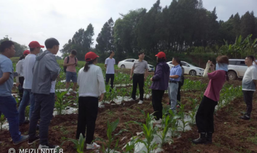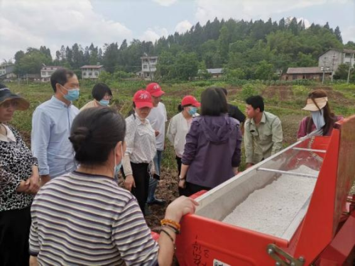 5月13日-14日,吕小荣教授一行来到安岳县高升乡天佛村、思贤镇清泉村等地进行种植情况的田间调研和现场指导培训,对当地大豆-玉米带状复合种植模式所存在的不足,如田间大豆、玉米行距配置不规范、播种机田间作业效果不佳等问题进行现场指导,并针对该区域地形地貌如何选择合适的播种机具和收获机具提出建议。