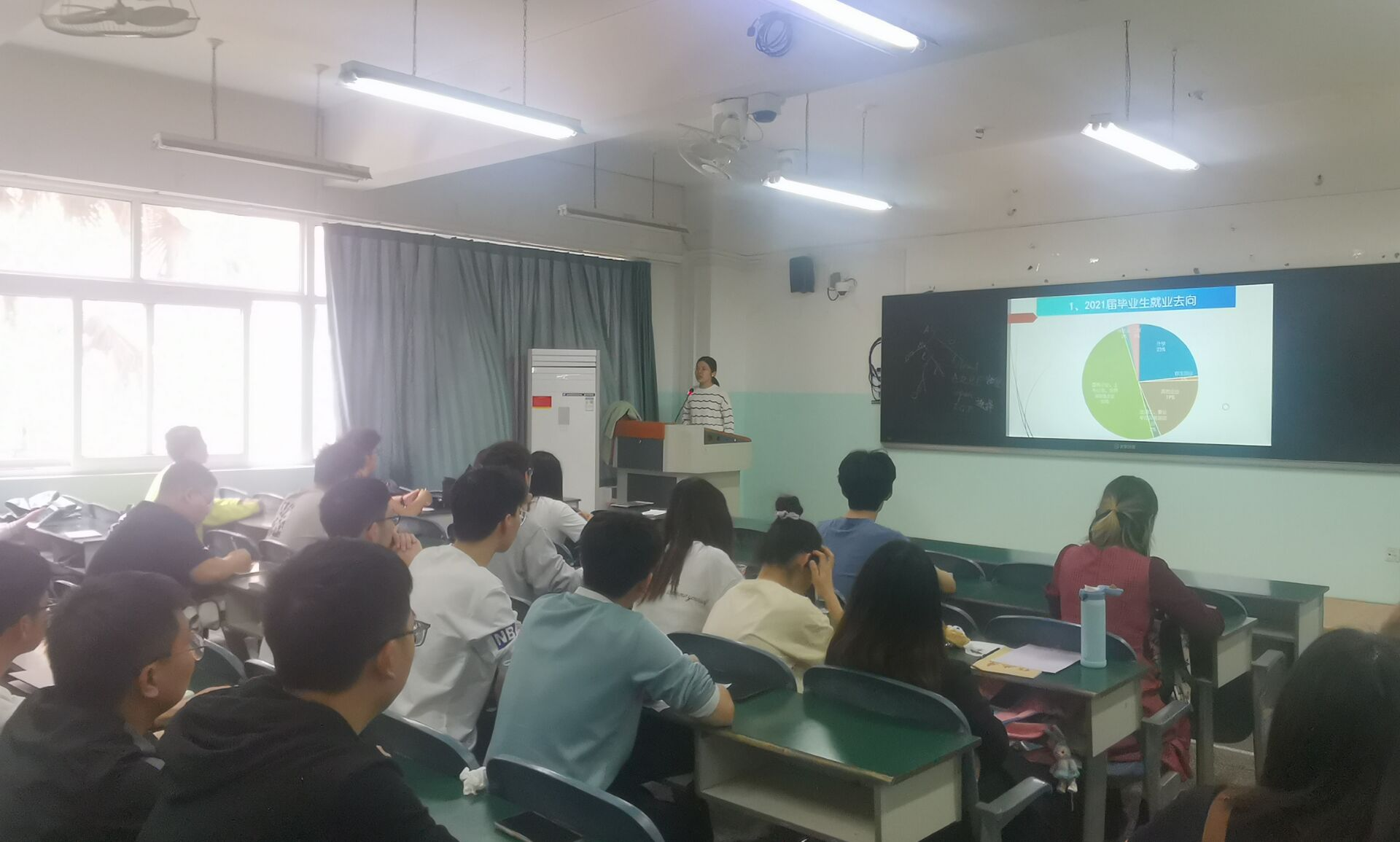 李建华老师通过介绍学院2021届毕业生就业去向,加强了同学们对未来就业的了解。同时,李老师介绍了多种求职信息的收集渠道,如学校就业指导中心,校园招聘会等;李老师也强调到,求职信息的整理要注意时效性、匹配度、完整性和可信度。