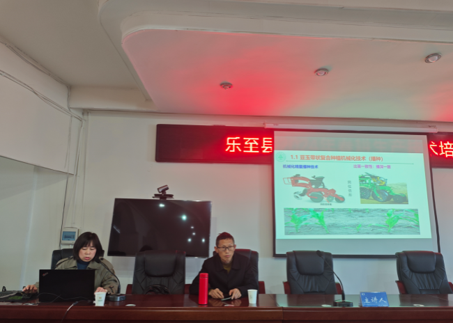 吕小荣一行先后到达资阳市乐至县农业农村局、雁江区保和镇盘龙村、安岳县清泉村开展调研指导和春播现场培训。吕小荣在由乐至县农业农村局主办的春播生产技术培训会上围绕播种、植保、田间施肥、除草、收获等关键环节,讲解了带状复合种植机械化技术,并针对推广该技术存在的问题进行了分析。同时,团队实地考察了雁江区保和镇盘龙村和安岳县清泉村,针对两地春播现状,吕小荣与当地农户交流了种植规模、播种机械的选择和注意事项、施肥量和施肥方式等技术经验,并实地测量了大豆、玉米播种的株距,提出了技术改进建议和实施方案。