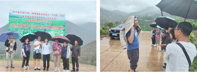 团队深入一线,与会东县桑蚕产业发展科普教育示范基地的种植户展开深入交流,了解当地大豆与桑树复合种植情况,针对目前存在的茂密桑树下种植大豆的问题提出建议,应避免将大豆过于靠近桑树种植,以扩大大豆接收阳光的空间,从而提高大豆产量。