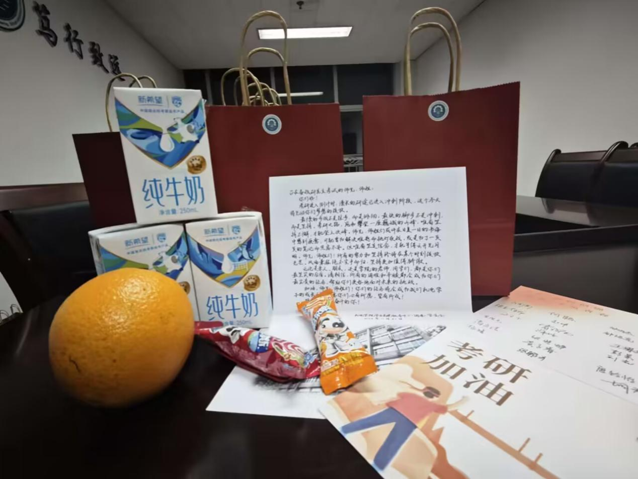 师生们结伴穿梭于一间间毕业生寝室,门扉轻启,怀揣着诚挚祝福,亲手将精心筹备的慰问礼包递到毕业生手中。礼包里,棒棒糖寓意 “加油打气”,承载着师生们殷切的鼓励;新希望牛奶满含祝愿,祈愿毕业生们未来一路顺遂、元气满满;圆润饱满的橙子则象征着 “心想事成”,寄托了学校对他们最美好的期许。“加油,师兄、师姐们!你们的经历将会成为我们机电学子的成长动力,愿你们心有所愿,皆有所成!”除此之外,还有一封带着院员工会全体成员签名的信件,笔触虽稚嫩,心意却滚烫,字里行间尽是学弟学妹们对学长学姐的由衷敬意与祝福
