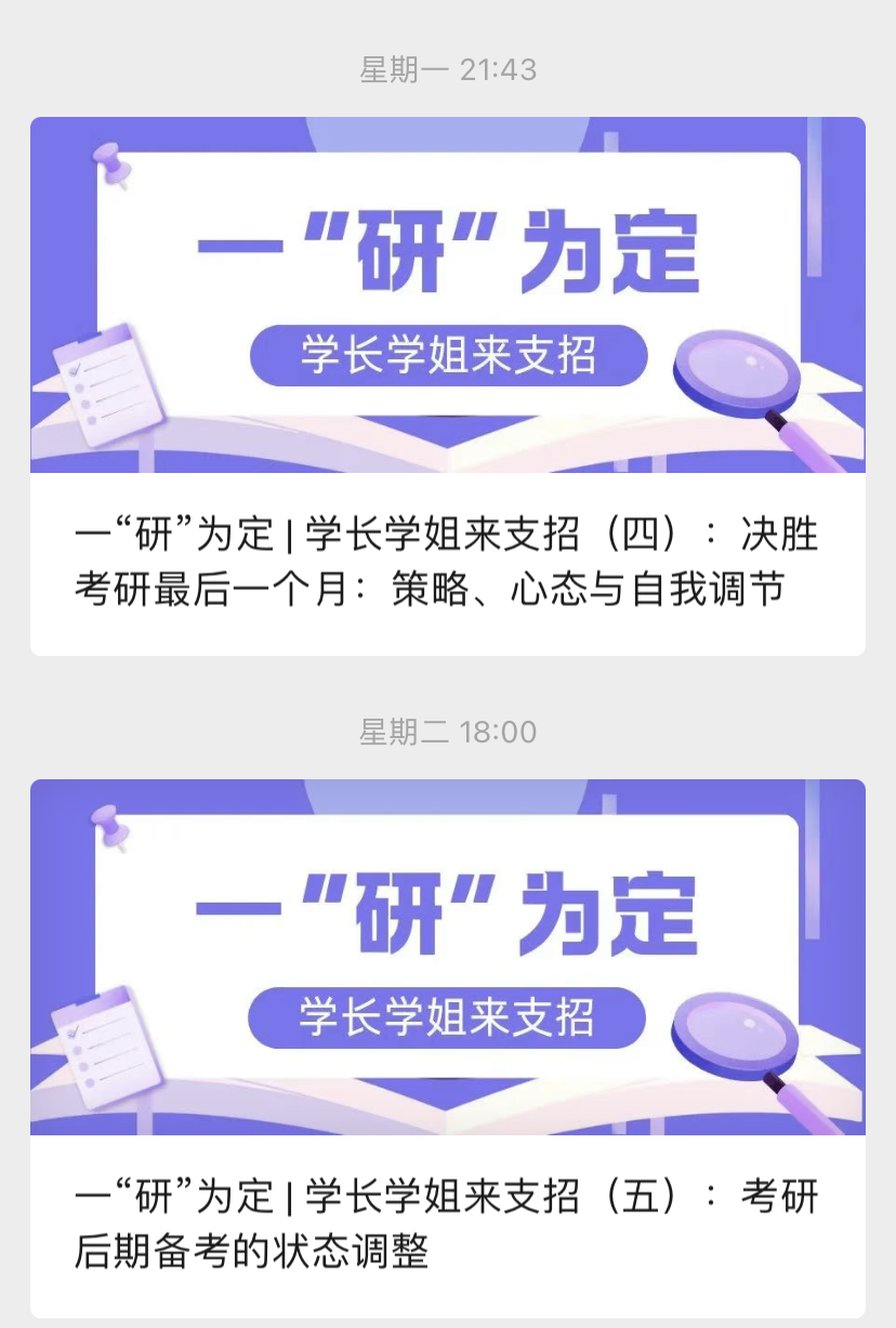 “距离考研就剩一个月了,坚持到如今已是不易,为你们感到骄傲!再坚持坚持,没有走上坡路是不累的。现阶段,不管别人学到哪了,做到哪了,不要乱心,你坚持去做你的。绝不打乱节奏,是一种自我的恒心。同时,不要过度焦虑,每一次的模拟考试成绩波动都是正常的,把它当作查漏补缺的好机会。要学会给自己积极的心理暗示,告诉自己“我可以的”,相信自己的努力不会白费。”在毕业生准备研究生考试的关键时刻,学院微信公众号推出“一‘研’为定 学长学姐来支招”系列推文,20余名2024届考研升学毕业生结合自身的考研经历通过文字、语音等形式分享考研后期的复习备考状态调整、心理调试等考研加油小贴士,以及具体考研科目的复习策略或冲刺要点等,多种方式支持、鼓励2025届考研学子朝着目标努力拼搏。