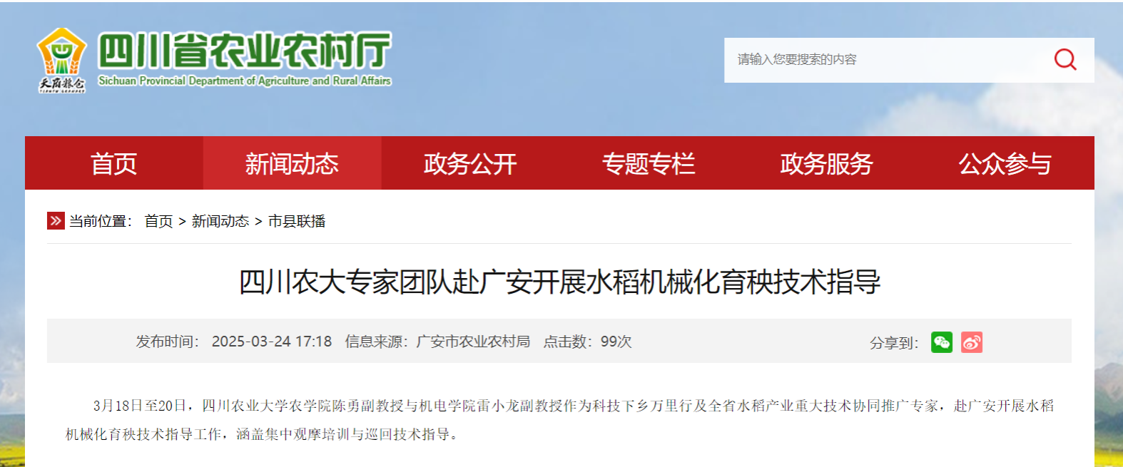 3月18日至20日,xc体育农学院陈勇副教授与xc体育雷小龙副教授作为科技下乡万里行及全省水稻产业重大技术协同推广专家,赴广安开展水稻机械化育秧技术指导工作,涵盖集中观摩培训与巡回技术指导。