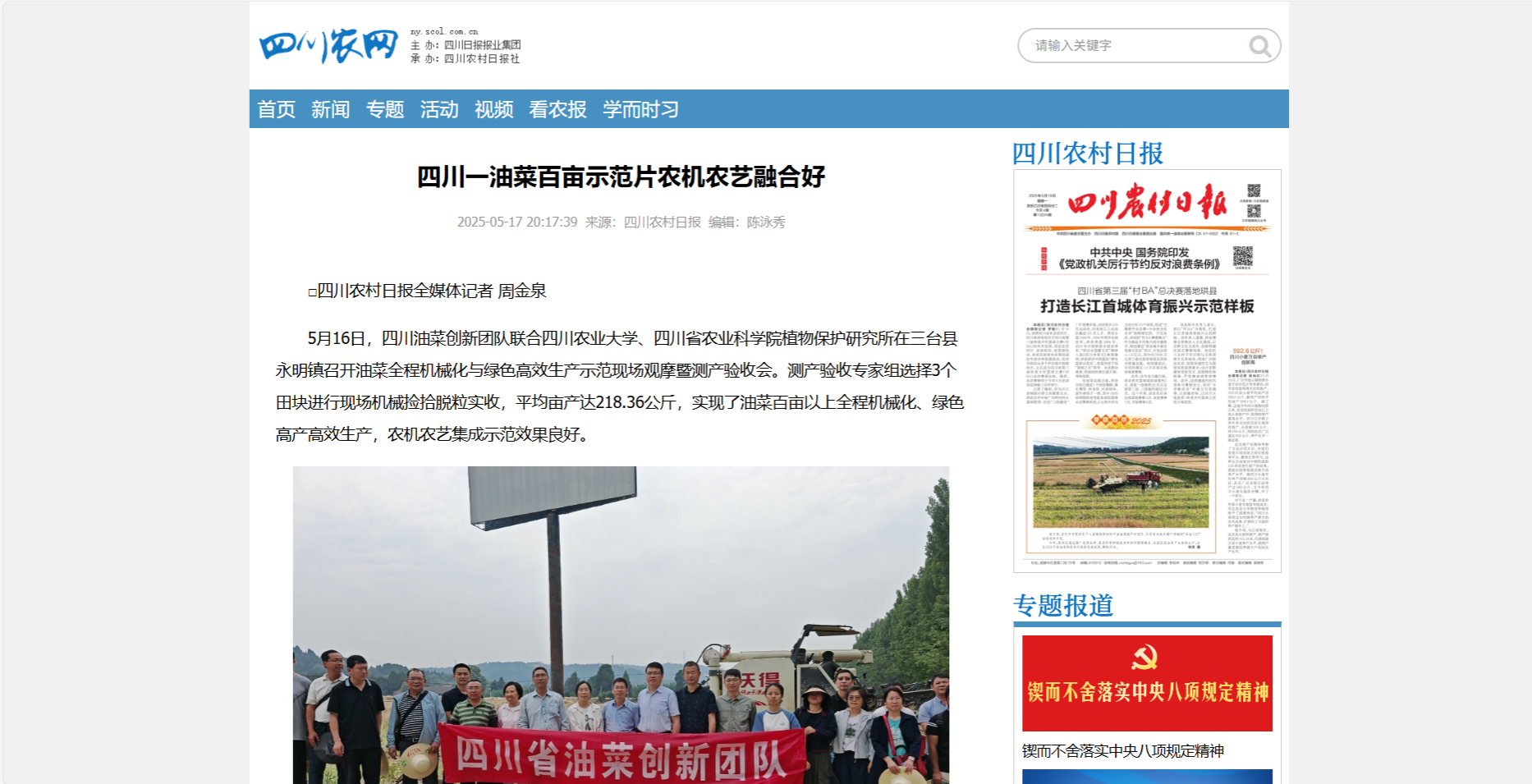 5月16日,四川油菜创新团队联合xc体育、四川省农业科学院植物保护研究所在三台县永明镇召开油菜全程机械化与绿色高效生产示范现场观摩暨测产验收会。测产验收专家组选择3个田块进行现场机械捡拾脱粒实收,平均亩产达218.36公斤,实现了油菜百亩以上全程机械化、绿色高产高效生产,农机农艺集成示范效果良好。