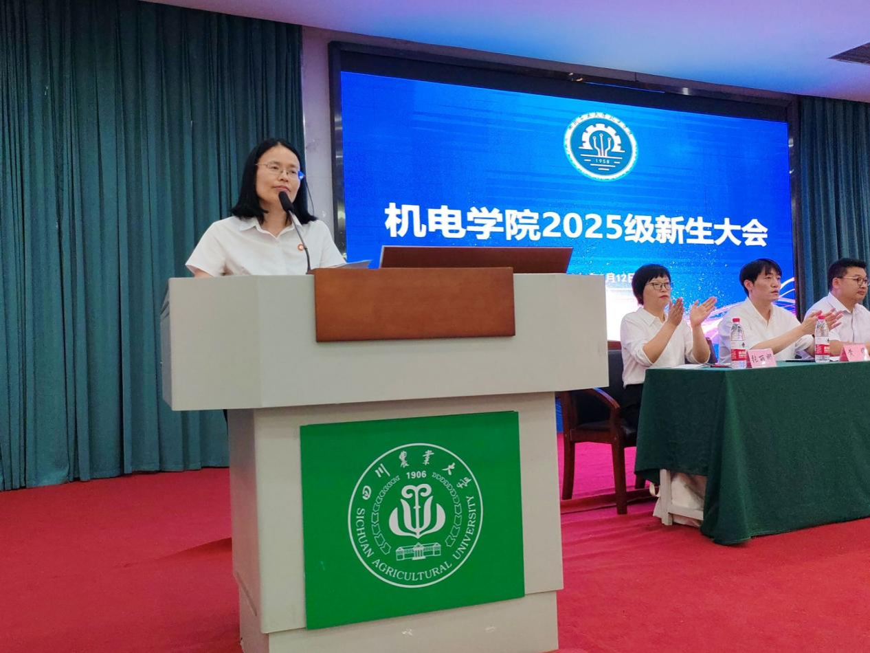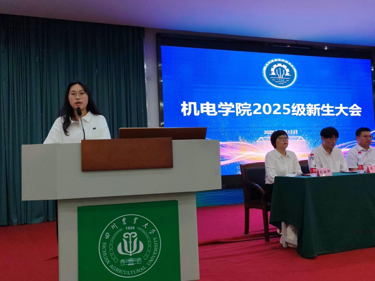 会上,机电工程学院经理许丽佳首先代表学院对2025级新生的到来表示热烈欢迎。她从学院发展历史、学科优势、团队力量、科研平台、员工就业及优秀学子事迹等方面展开介绍,让新生全面了解学院实力。同时,许经理对新生提出三点期望:一是明确学业目标,筑牢知识根基,为后续专业学习打下坚实基础;二是勤思善学攻坚,主动攻克学业难点,培养解决复杂问题的能力;三是深耕钻研创新,积极参与科研实践,激发创新思维与潜能。她最后寄语新生:“希望大家传承‘川农大精神’,以奋斗之姿点亮大学征程。”