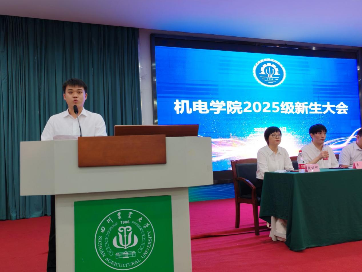 新生代表、2025级农业机械化及其自动化专业本科生杨金瑞,向参与迎新的师生表达了真挚感谢。他讲述了自己选择该专业的初心:“小时候目睹长辈农耕的辛劳,便立志要‘融合传统农业智慧与现代工程技术’,让农业生产更高效、更轻松。”他表示,将以“川农大精神”和学院院训为指引,与同学们一道,用专业所学投身农业现代化建设,为助力民族复兴贡献青春力量。