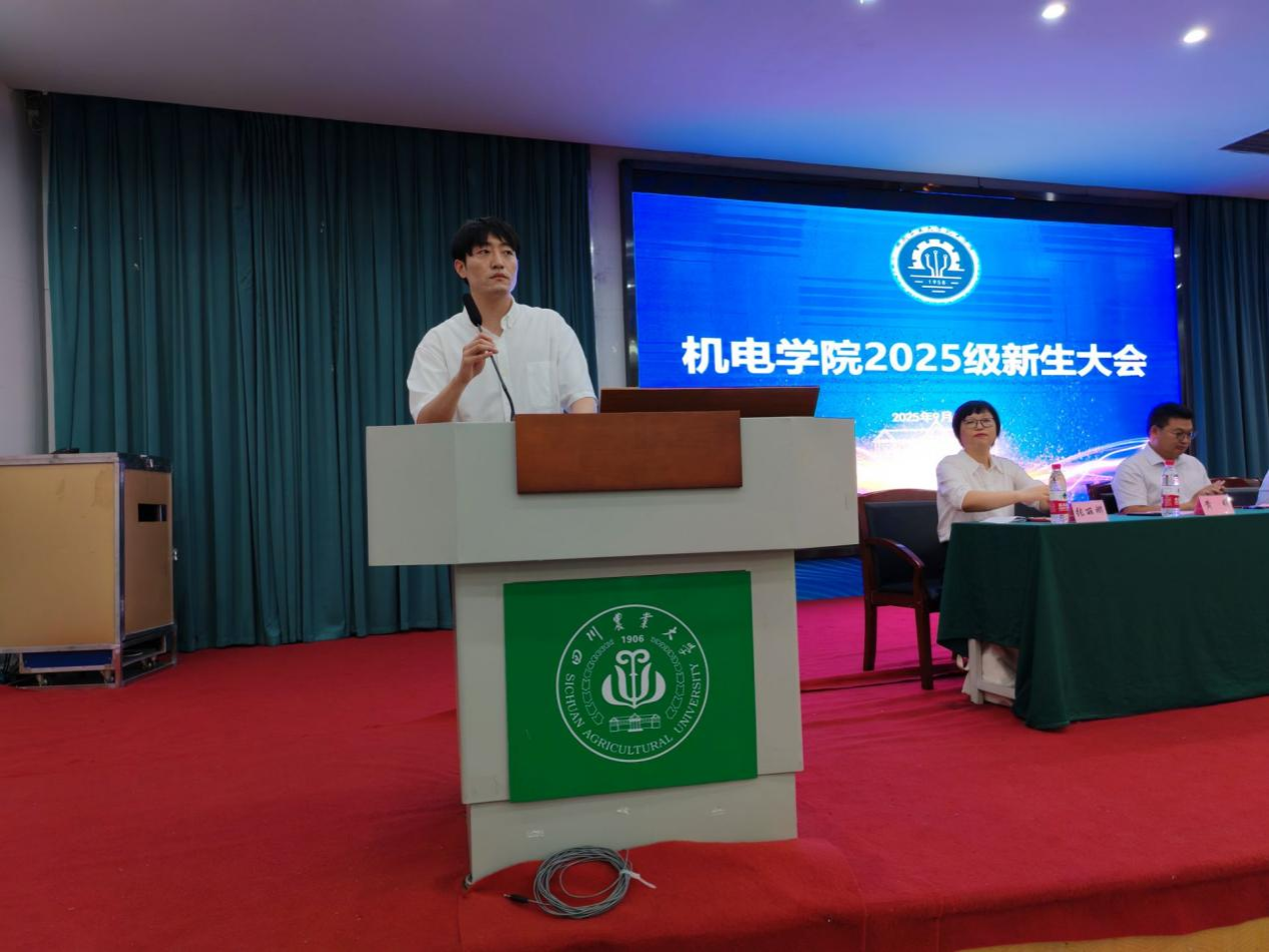 高年级员工代表、农业机械化工程专业2023级研究生李尉,以“过来人”的视角热烈欢迎新生。他分享了自身参与农业部丘陵地区农机专项研究的实践经历——从田间调研到设备优化的全过程,生动展现了“理论联系实际”的重要性。他号召新生:“传承‘川农大精神’,把个人理想融入国家发展大局,以‘强农兴农’为己任,在实践中求真知、长本领,让专业所学服务农业发展。”