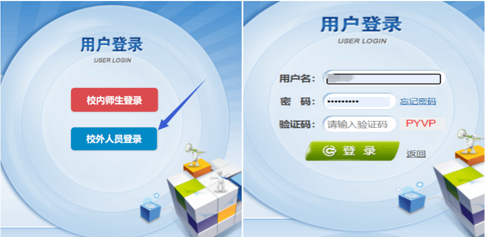 点击校外人员登录。用户名:26+考研报名号(学校初试成绩查询中可查报名号<点击查询>,默认密码:身份证号码后6位。