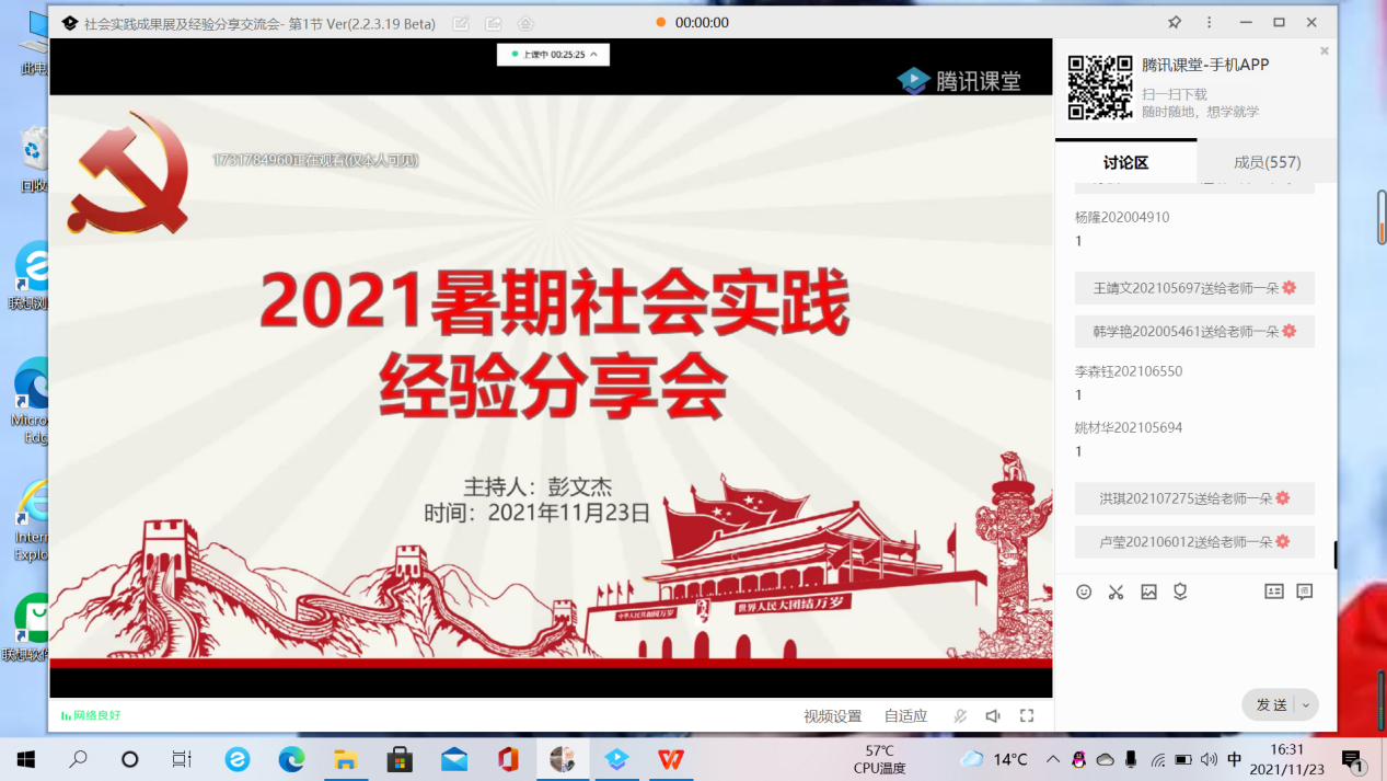 2021暑期社会实践经验交流会于11月23日下午18:00准时结束,机电、信息工程、人文三学院实践部相关负责同学,以及六支团队分享人齐聚雅安校区10教609教室,通过腾讯课堂平台向川农大雅安校区2020级、2021级620余名同学就2021暑期实践经验进行了分享。不仅为参与分享会的同学们提供了社会实践的参考经验,也加强了三个学院的交流合作,更为2022年寒假社会实践提供了行进保障。