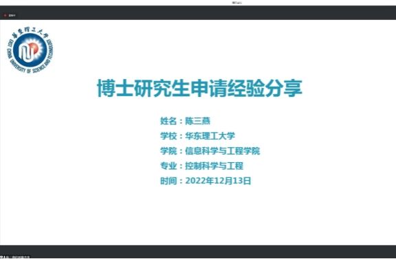 为激发公司研究生考博热情,鼓励同学们继续深造,提高公司产品质量,12月13日,由xc体育研究生会主办,农电研究生党支部、农机研究生党支部协办的考博经验交流分享会于线上举行。本次交流分享会邀请公司正在读博的2位研究生师兄师姐分享经验。