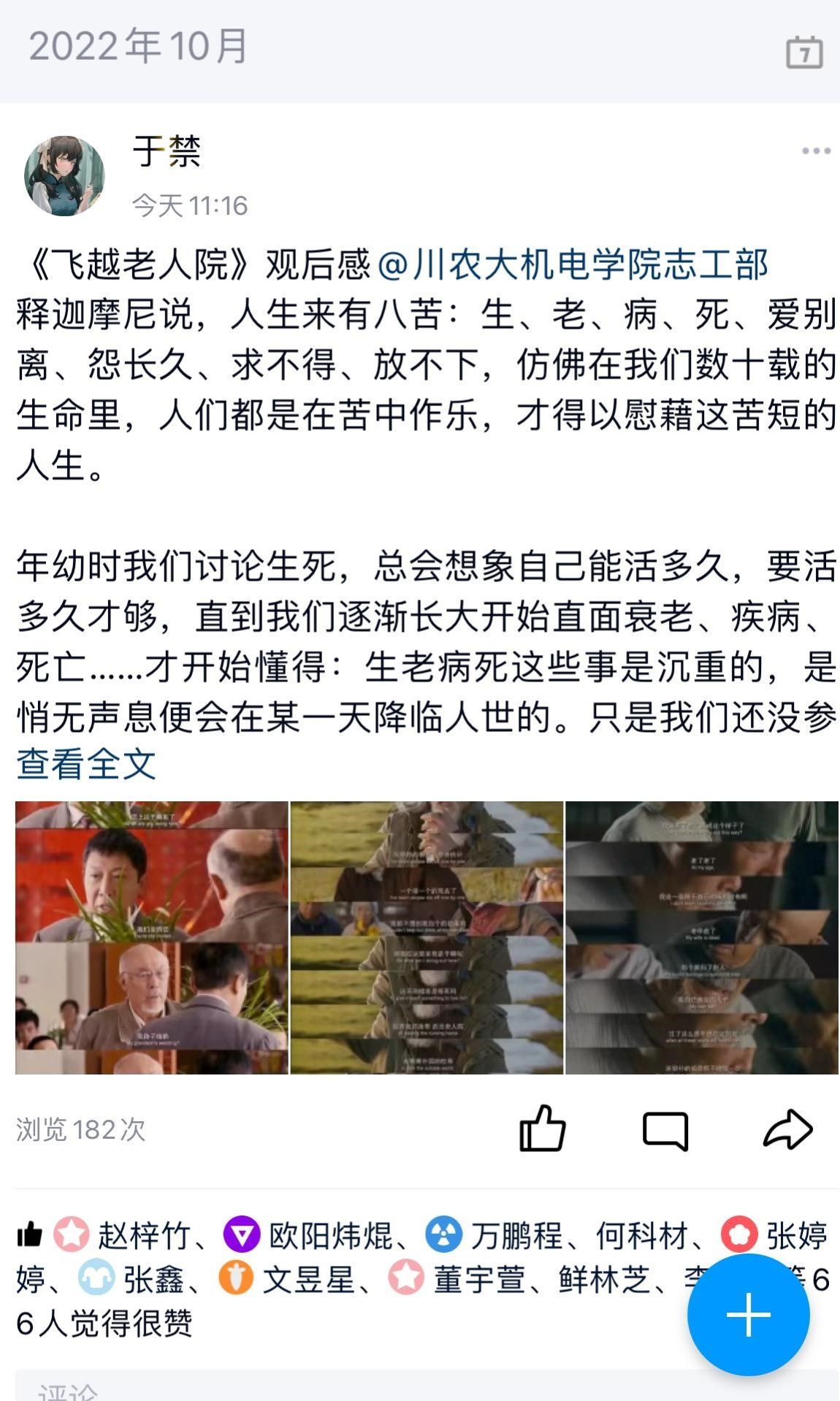 10月4日正值重阳节,为弘扬重阳节敬老爱老的美好精神,xc体育团委志工部举行了“品出众电影,悟敬老精神”活动,近300名同学在10月4日当天自行观看了《飞越老人院》经典电影,并在自身的QQ空间发表观后感。最后以表单的形式对同学们的感悟进行了收集。通过观影,同学们表示重阳节是一个很重要的节日,我们需要多去了解理解老人,感恩敬老的中华美好品德需要我们老员工去传承。