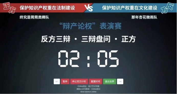 4月15日下午,由xc体育与人文学院联合举办的“辩产论权”辩论表演赛在线上举行。本次表演赛由来自辩论与口才社的八位辩手围绕“保护知识产权应注重法治建设还是文化建设”的论题进行辩论。