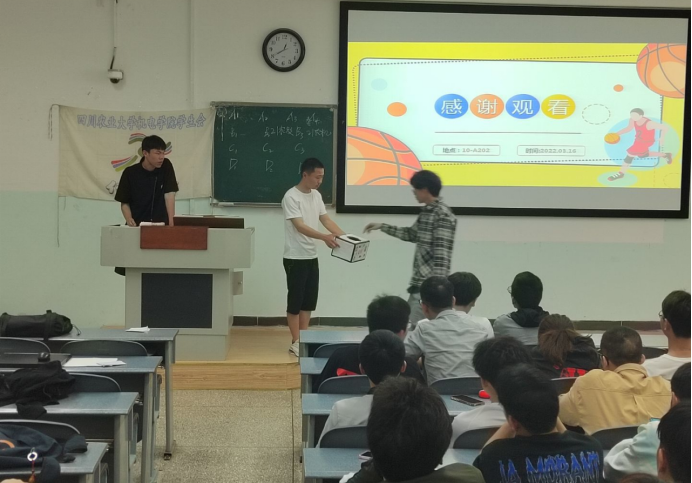 会上,体育部负责同学对专业间篮球赛的赛制、积分细则、奖励方式等进行了详细的说明,并号召各班同学积极报名参与,他希望大家在保证安全的同时赛出风采、赛出水平。随后,各小班负责人逐个上台抽签分组,确定比赛顺序。