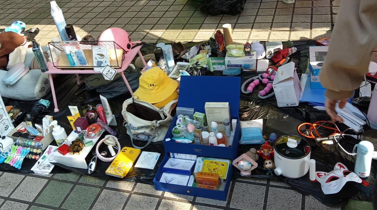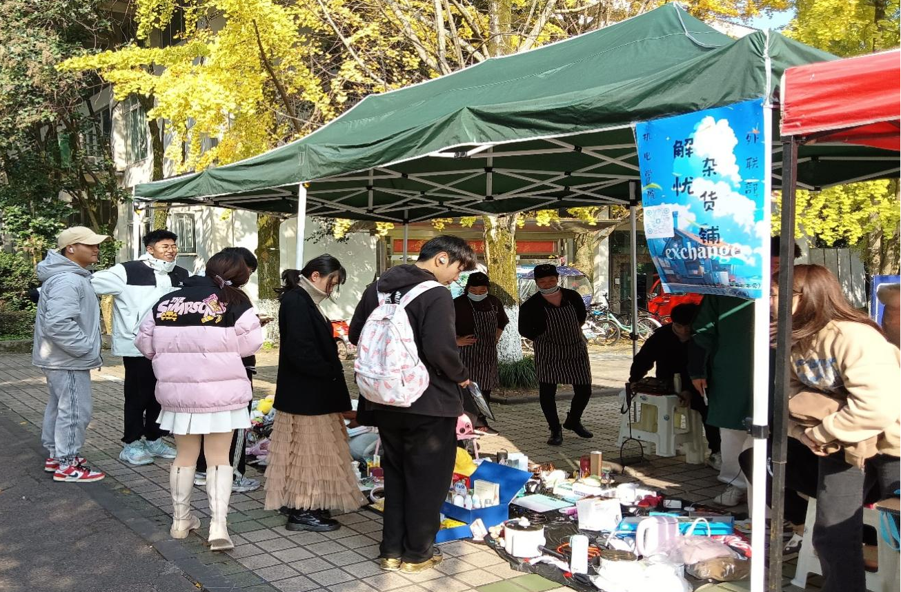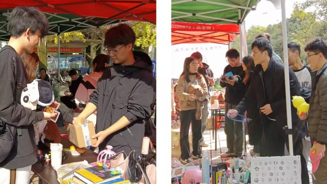 11月19日(周日),在二区杏苑食堂旁开摊的“解忧杂货铺”新增了套圈活动,部门成员巧妙地利用回收的套圈,创新性地添加了互动小环节,吸引了更多同学的关注。