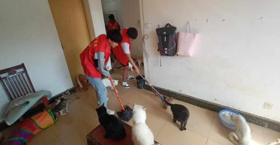 志愿者以身作则甘当“铲屎官”,利用工具将地面的猫屎铲除,仔细清扫地面的垃圾,整齐摆放基地的杂物,认真清洗猫用的沙盆,并一步一步将地板拖净,让流浪猫基地焕然一新。