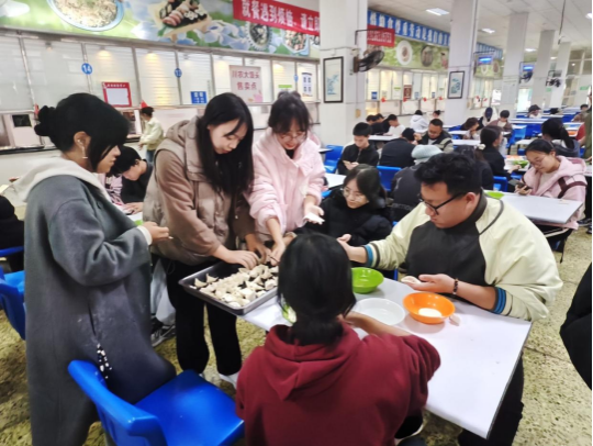活动现场,同学们围坐在一起,纷纷挽起袖子,动手包起了饺子。在欢声笑语中,大家分享着各自的故事和生活点滴,彼此的距离逐渐拉近,一个个形状各异的饺子也陆续摆满了餐桌。当热腾腾的饺子出锅时,整个食堂都弥漫着诱人的香气。大家品尝着自己亲手包的饺子,脸上洋溢着幸福的笑容。