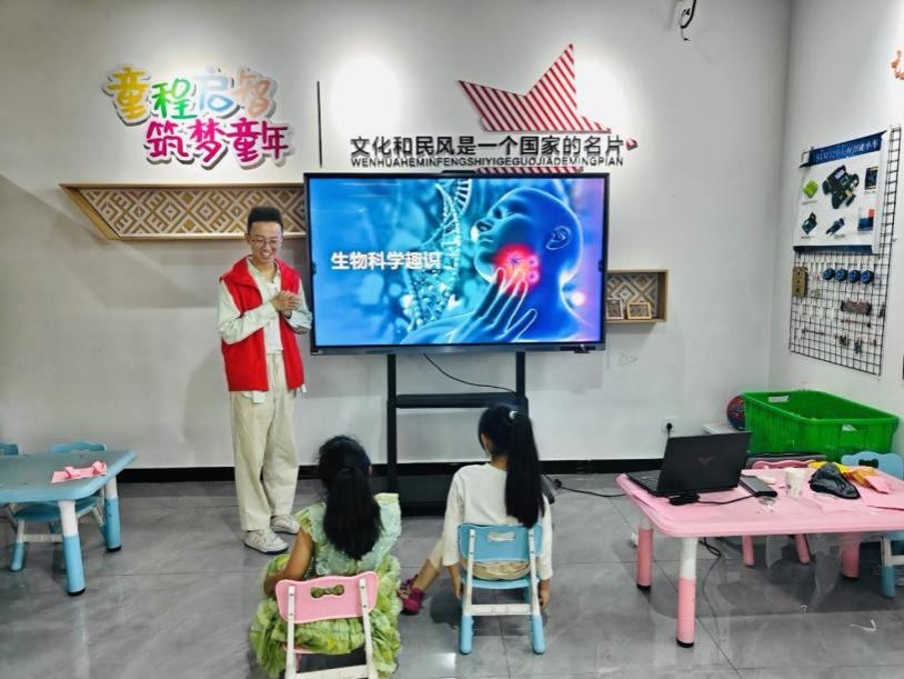 在“生物学的应用”环节,志愿者向孩子们讲述了陈薇院士团队研发新冠疫苗的“中国速度”、袁隆平院士培育杂交水稻的“稻田奇迹”,以及众多科学家在生物学领域的奋斗故事。孩子们深受鼓舞,纷纷表示:“长大后也想成为这样的科学家!”
