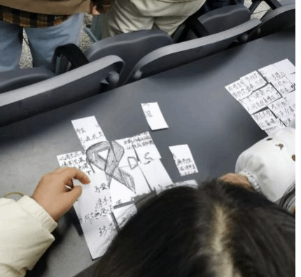 12月上旬,“我的防艾‘上上签’,为青春健康撑腰!”线下创作活动与“谣言粉碎机,防艾猜猜看”互动游戏在二区主干道同步开启。学子们或独自挥毫,或两人携手,在A4卡纸上精心书写40 - 50字的防艾核心知识点,并搭配创意插画与标语设计,将抽象的科学知识转化为直观生动的视觉盛宴。在你演我猜游戏区,参赛小组以肢体动作演绎日常行为,在欢声笑语中明辨艾滋病传播风险。大家还共同参与“生命DNA螺旋”红丝带艺术装置创作,以集体之力传递抗艾决心。