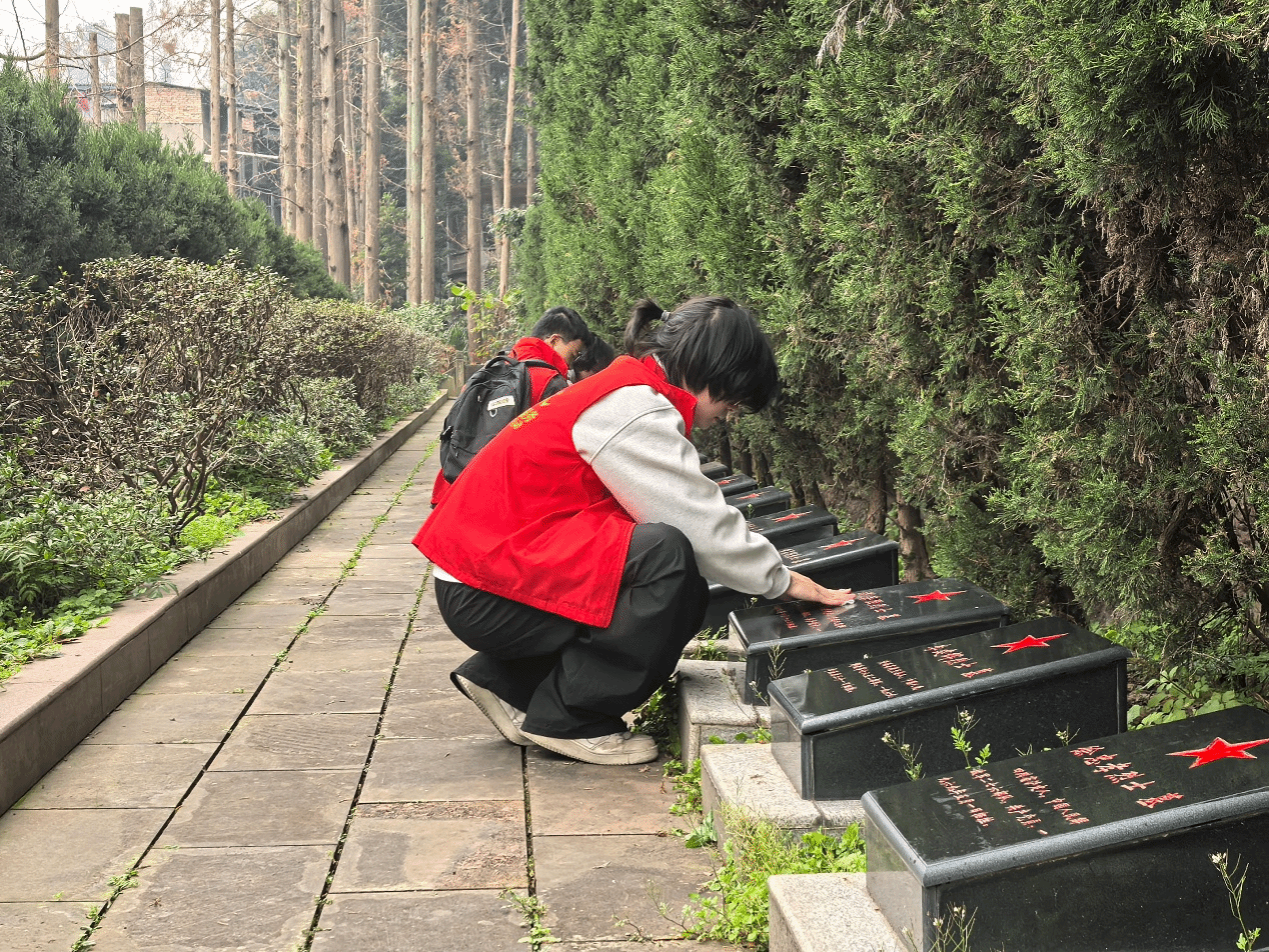 图为:xc体育文娱部成员擦拭烈士碑