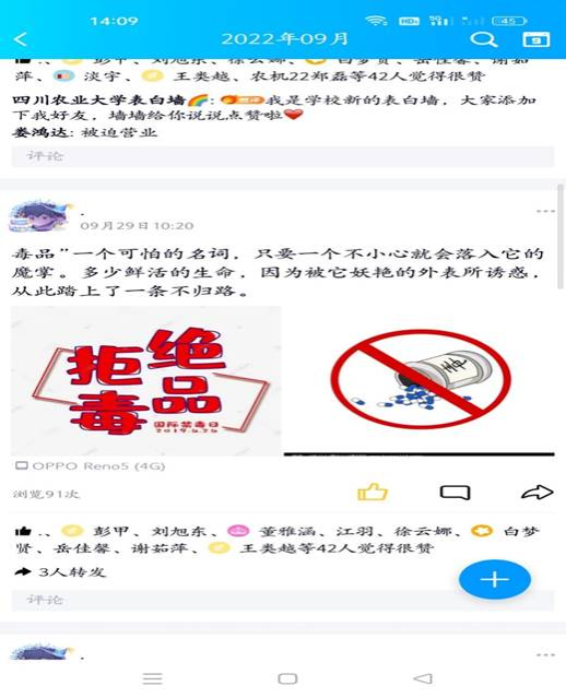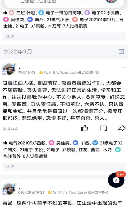 本次活动是为期7天的禁毒知识打卡活动,另外还进行了毒品相关知识的答题。同学们积极参与,每天按时打卡,有的宣传毒品的危害,有的警戒同学们不能沾染毒品等。大部分同学们图文结合,打卡质量较高。通过学习禁毒知识,配套的检测答题通过率极高。