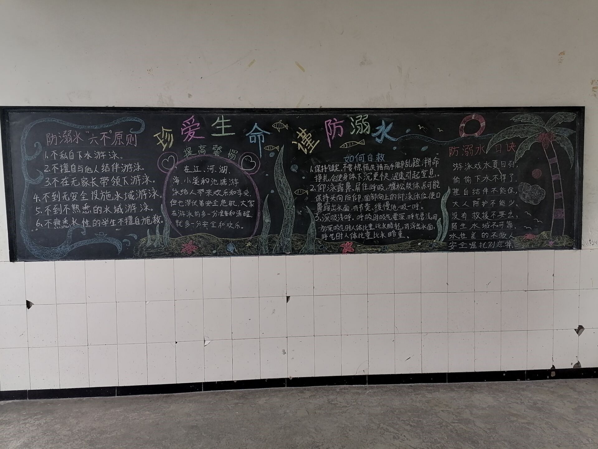 志愿者们有备而去,他们以几支粉笔,在黑板上留下了赏心悦目的痕迹——一黑板端庄正楷的文字和可爱的插画。志愿者们认真创作,完成了“交通安全”、“预防溺水”、“食品安全”、“森林防火”和“禁毒宣传”五种主题六个教室的板报。