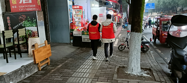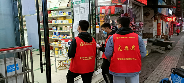 (图为志愿者们正在仔细排查疏漏店铺的背影 薛健 摄)