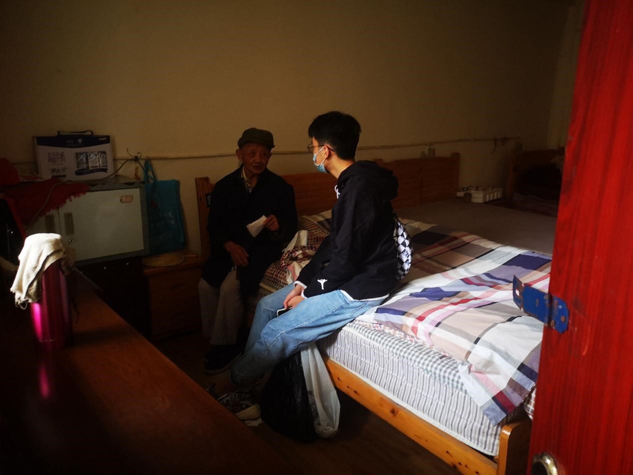 (图为志愿者在老人房间里跟老人聊天 钟浩然 摄)