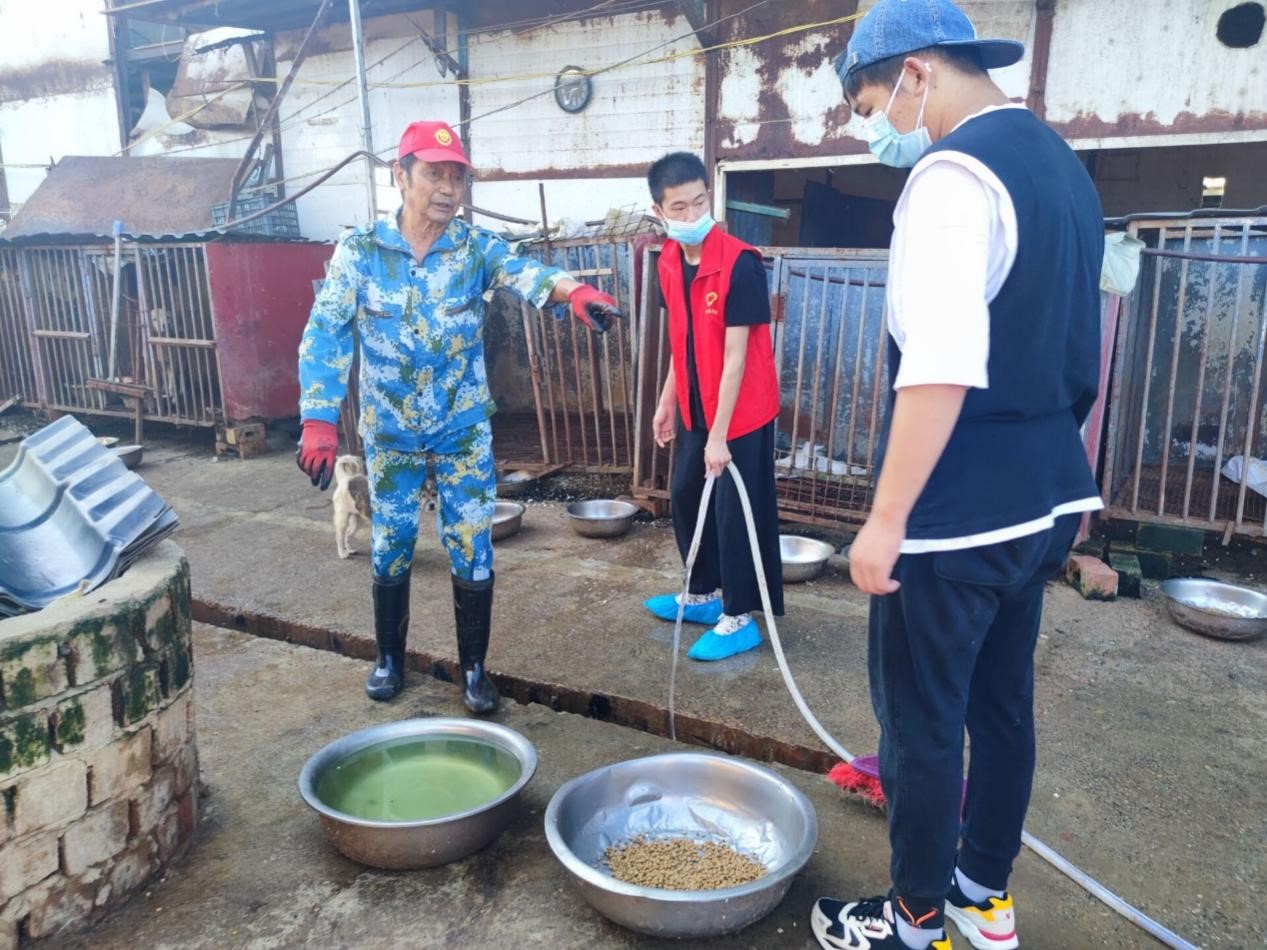 进入场地,志愿者们分为两队,一队在水池边清理流浪狗们日常吃饭使用的盆子,盆子是铝制品,但经过流浪狗的长期使用,原本饱满的盆子被踩踏得坑坑洼洼,大多数都已经漏水,好在工作人员额外设置了饮水装置。盆子上还附着了许多异物,有排放的粪便,有裹着杂草的泥,这为志愿者的清理工作带来了许多困难,有志愿者清理盆子时不小心划破了手套,但依旧坚持到清理完所有盆子。另一队志愿者拿着清理工具,提着水龙头来到“狗圈”中,冲刷掉遗留的粪便,帮忙疏通下水道。由于分工明确,配合默契,很快便完成了清洗任务。