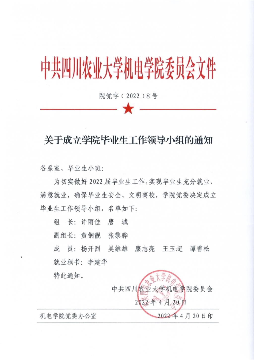 公司党字[2022]8号-关于成立学院毕业生工作领导小组的通知