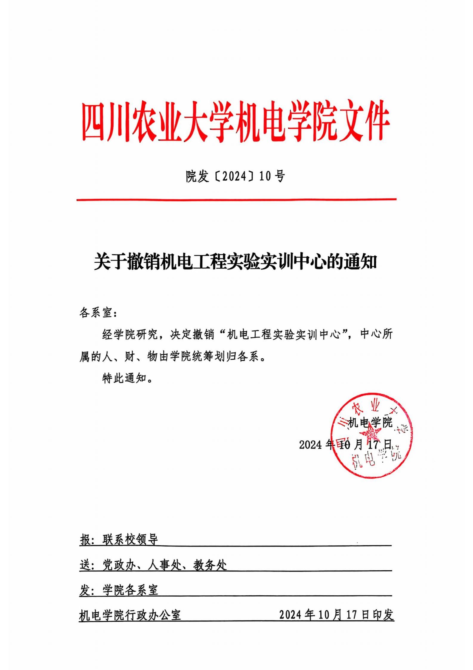 xc体育院发[2024]10号-关于撤销机电工程实验实训中心的通知